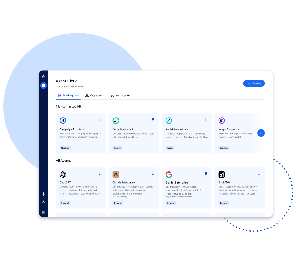 Agent Cloud is a secure AI workspace for marketers to use top LLMS and custom-built AI assistants. This means you can toggle between different LLMs, from Gemini to Claude and ChatGPT, to get the most out of their unique strengths. Agent Cloud also helps eliminate tool sprawl and the security risks of "shadow AI."