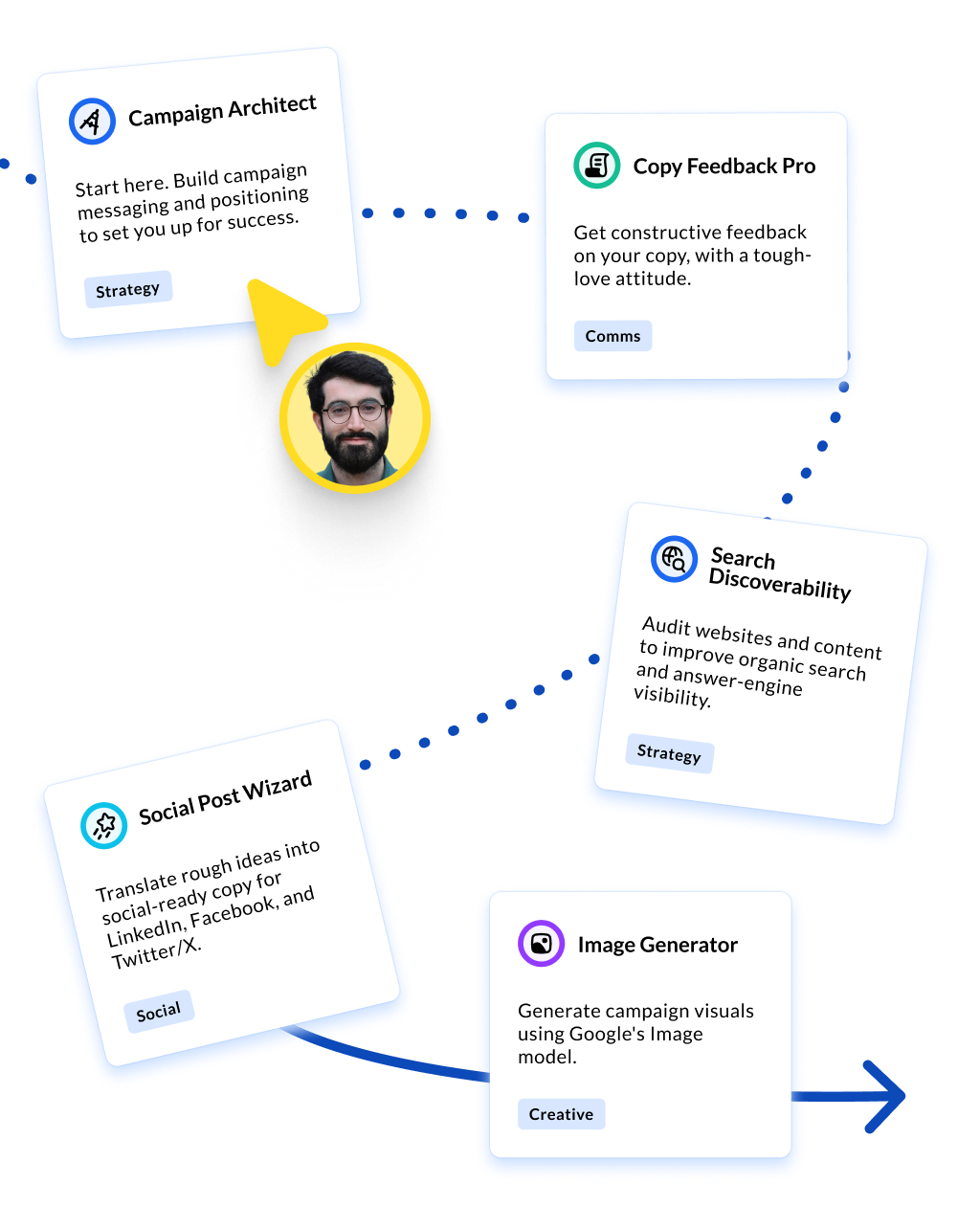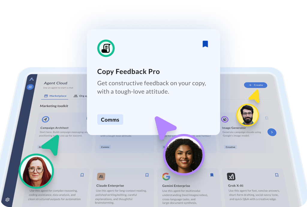 The Agent Cloud marketing toolkit brings together custom agents built by our team of marketers, along with the best third-party integrations across the marketing space. That means your team has instant, easy access to agents that will help perform brand audits, write creative briefs, handle social media monitoring, create image and video assets, test campaign messaging, improve SEO and GEO, and do deep dives into specific topic areas.