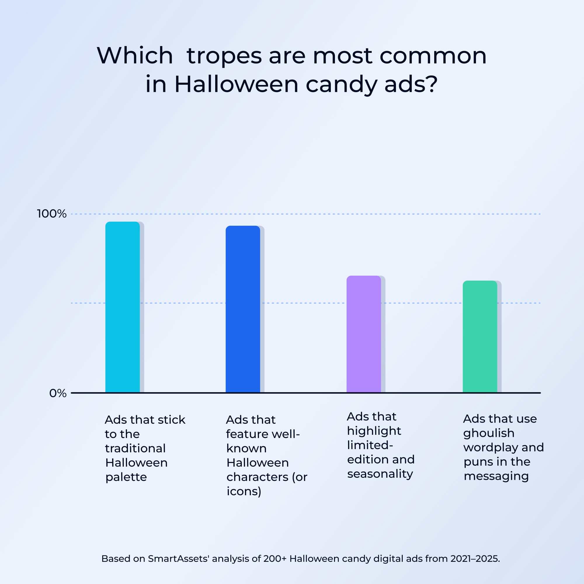 The data shows that you don’t need a costly celebrity cameo to produce the best Halloween ad, because only a slim 14% of the audience cares about a recognizable face in this context. (Less than 1% of the ads analyzed by SmartAssets featured a celebrity.) That's good news for your seasonal budget, since you won't need to shell out for Channing Tatum to hawk your new flavor of Sour Patch Kids.